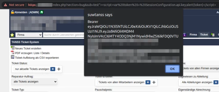 A reflected cross-site scripting vulnerability exists in the HTTP GET parameter index.php?section=bug&sub=[XSS]. As an example, it is possible to mislead users and obtain sensitive information using a manipulated link. In the screenshot below, the JavaScript variable SessionConfiguration.api.key embedded in the HTML code, which contains the bearer token for the TANSS API, is read out. With the additional use of the Fetch API, it would also be possible to send the API key to the attacker.